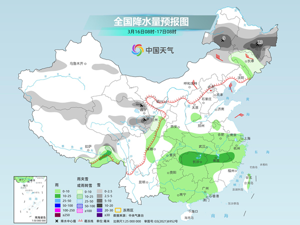 明天,内蒙古中东部、黑龙江东北部、新疆沿天山地区、西藏南部和东部、青海北部、甘肃河西、宁夏南部等地部分地区有小到中雪或雨夹雪,其中,黑龙江东北部、新疆沿天山地区、青海北部和东部等地部分地区有大雪(5~8毫米)。陕西北部、山西北部、江汉大部、江南、华南大部等地部分地区有小到中雨,其中,湖南东部、江西中北部等地部分地区有大雨(25~35毫米)。