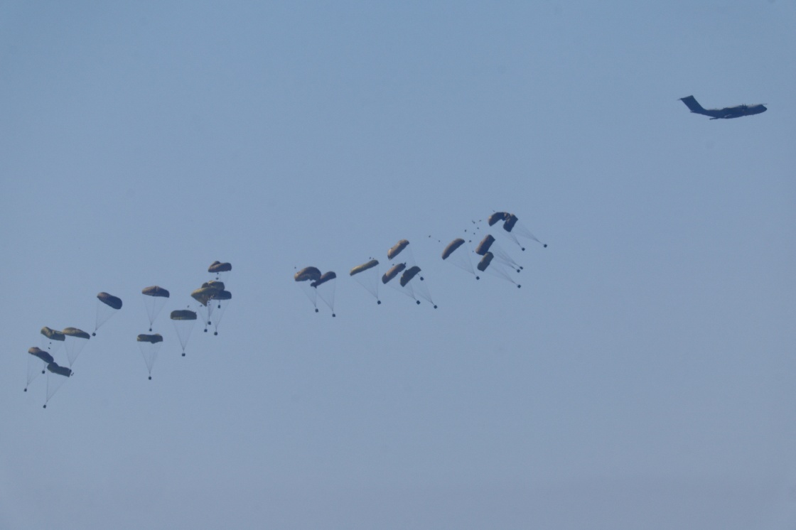 这是3月10日在加沙与以色列边境以方一侧拍摄的飞机向加沙地带北部空投救援物资的场景。 新华社/路透