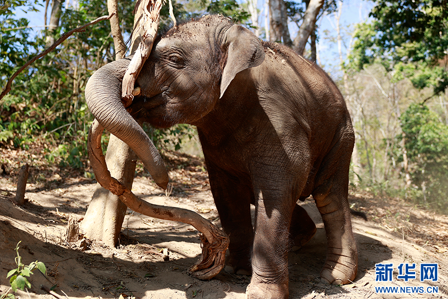 亚洲象“龙龙”在和藤蔓“较劲”(3月1日摄)。新华网 徐华陵 摄
