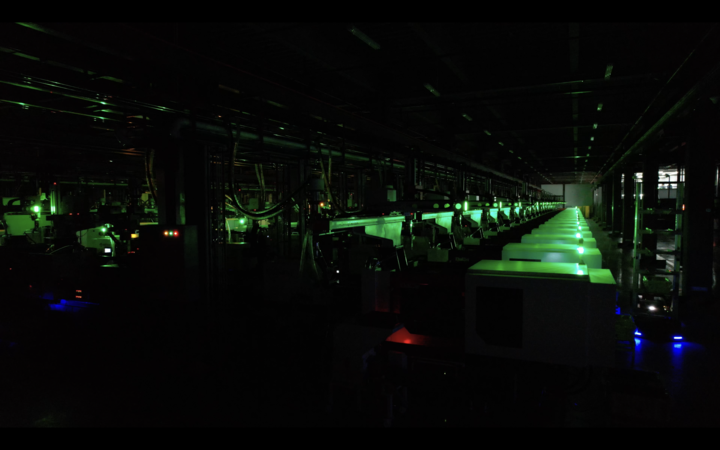 搭载摄像头的设备“摸黑作业”,自动识别二维码抓取物料;AGV搬运机器人沿着预设路线穿梭自如……