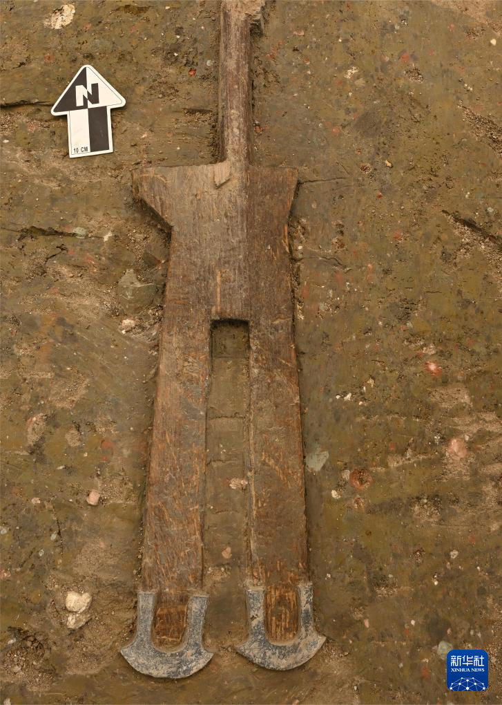 这是武王墩墓内出土木柄铁锸(2023年8月3日摄)。 新华社发(安徽省文物考古研究所供图)