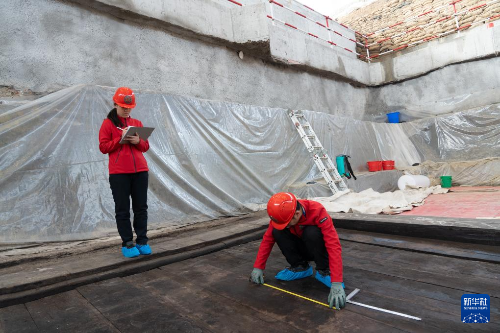 考古人员在武王墩墓测量椁板数据(2024年3月16日摄)。 新华社发(安徽省文物考古研究所供图)