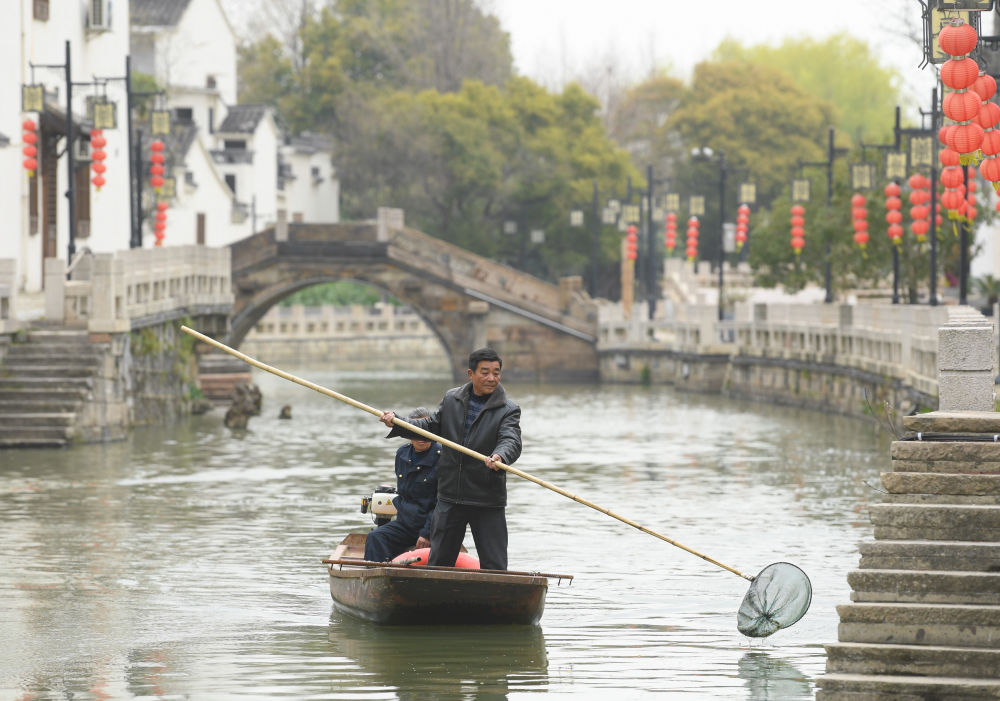 ▲2023年3月16日,在太湖畔的浙江省湖州市织里镇义皋村,保洁员在清理河道。多年来的溇港整治使得太湖周边河道水质明显改善,也为乡村旅游注入动力。 新华社记者 翁忻旸 摄