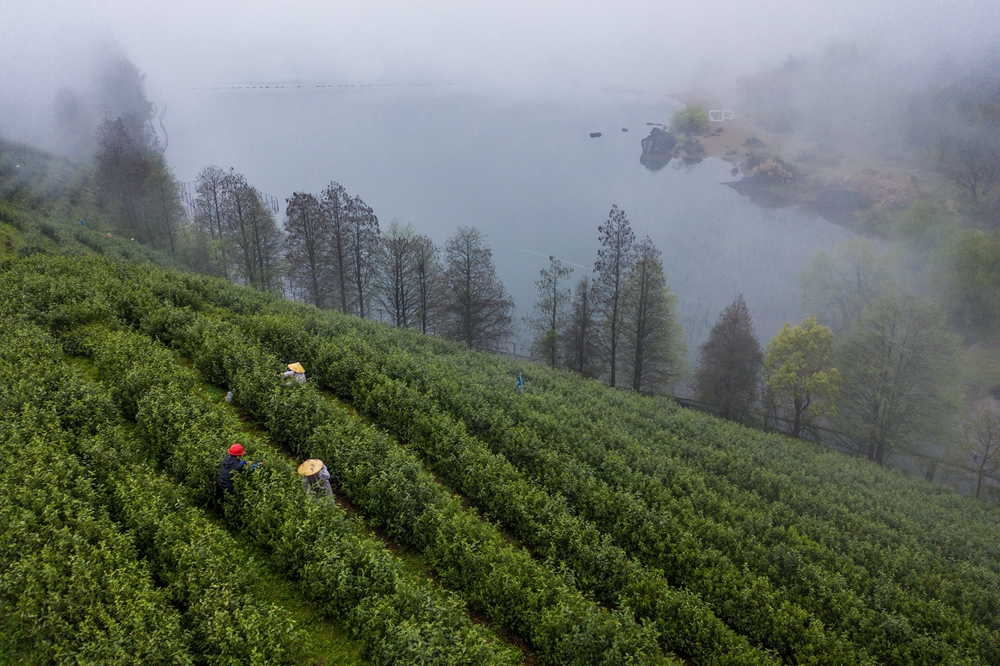 ▲2024年4月7日,在位于浙江省金华市金华山鹿田村的婺州举岩茶基地,茶农在采摘举岩茶鲜叶,发展特色茶产业是推动当地百姓共富的重要途径之一(无人机照片)。 新华社记者 徐昱 摄