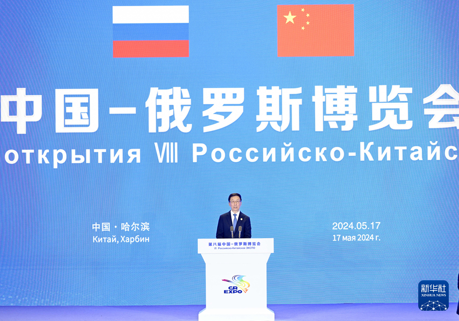 新华社哈尔滨5月17日电(记者朱超、刘赫垚)5月17日,国家副主席韩正在哈尔滨同俄罗斯总统普京共同出席第八届中俄博览会开幕式,宣读习近平主席贺信并致辞。