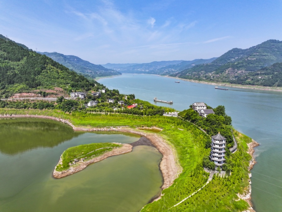▲近年来,重庆市万州区积极开展长江生态保护与修复治理,实施库岸整治与环境提升,打造绿色生态长廊,在筑牢三峡库区生态屏障的同时,建设滨水绿化带和亲水休闲带,取得良好的生态效益和社会效益。图为5月15日拍摄的重庆市万州区黄柏乡狮子岛及长江景象(无人机照片)。 新华社记者 王全超 摄