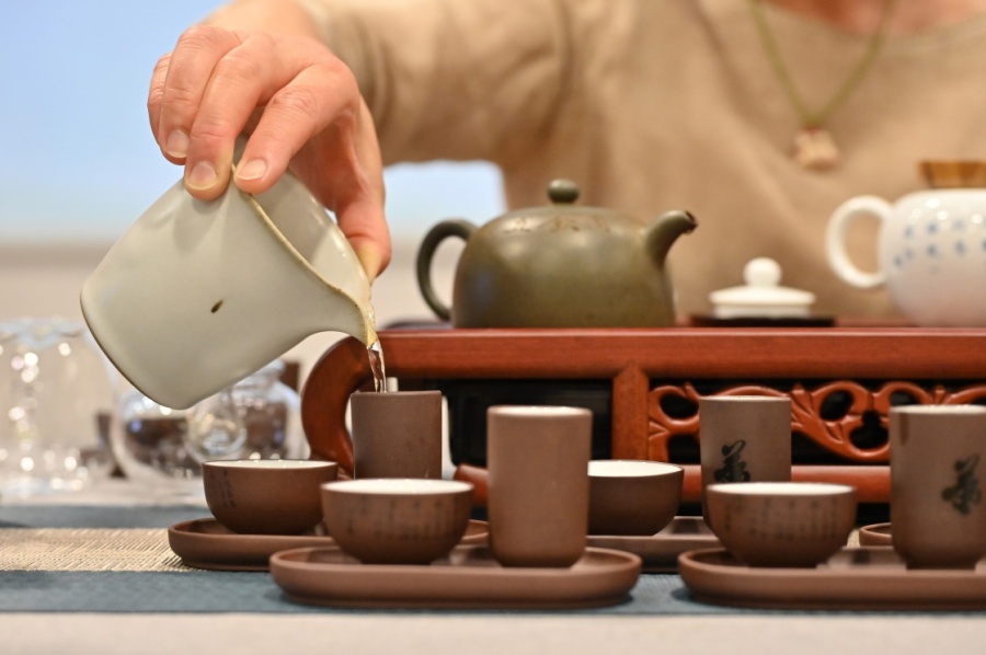 ▲5月21日是国际茶日,德国柏林中国文化中心举行茶文化体验活动,邀请中华文化爱好者现场观看茶艺展示并品尝中国茶,近距离感受中国茶文化。图为茶艺师在茶文化体验活动上进行茶艺展示。 新华社记者 任鹏飞 摄