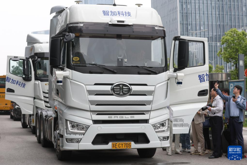 6月1日,人们在参观两辆由苏州智加科技有限公司与车企共同开发的智能驾驶重型卡车。新华社记者 杨磊 摄