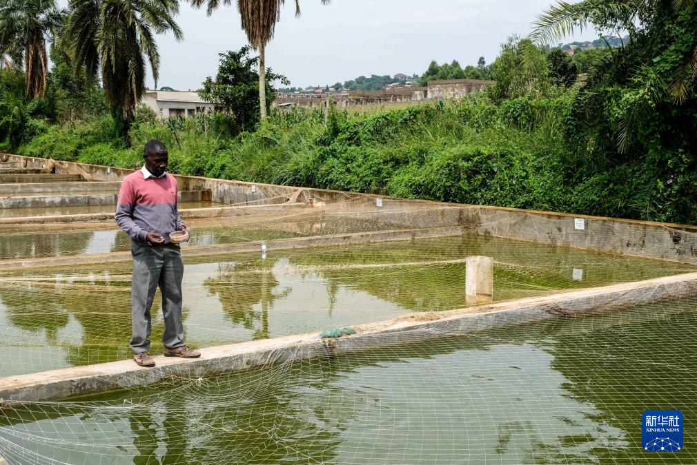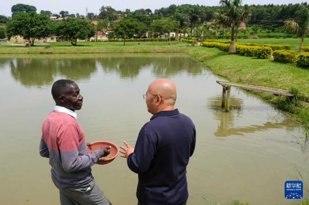 在乌干达首都坎帕拉市郊的乌干达水产研究与发展中心,中国水产专家陈太华正蹲在池塘边查看鱼苗情况,一位当地员工熟练地投喂饲料。乌干达水产研究与发展中心是中国-联合国粮农组织-乌干达(三期)南南合作项目水产示范基地,这里的渔场排灌系统采用中国技术建设而成。