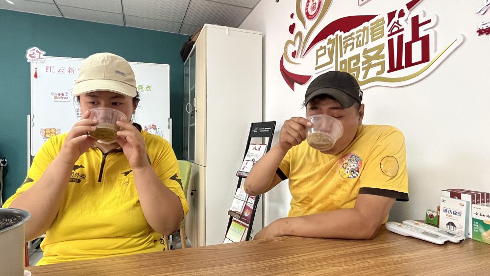 刘杨(右)在驿站里喝绿豆汤。新华社记者 徐思钰 摄