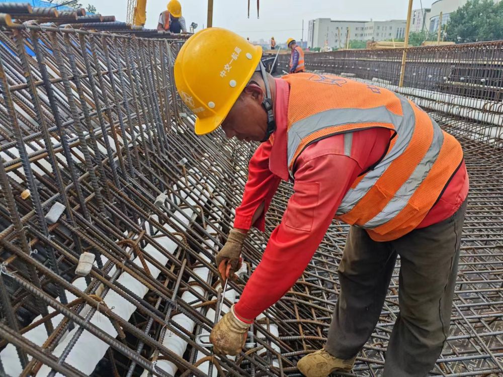 在中交集团负责投建一体化运作的天津某项目现场,钢筋工范俊华与工友们正在绑扎钢筋。不到半小时,额头挂满汗珠,汗水浸湿安全服,紧贴在身上。