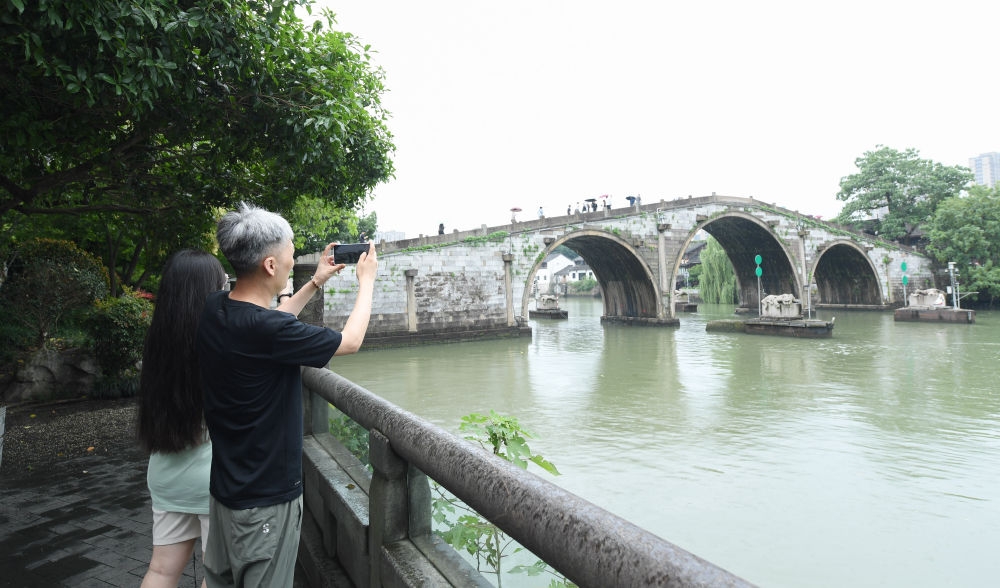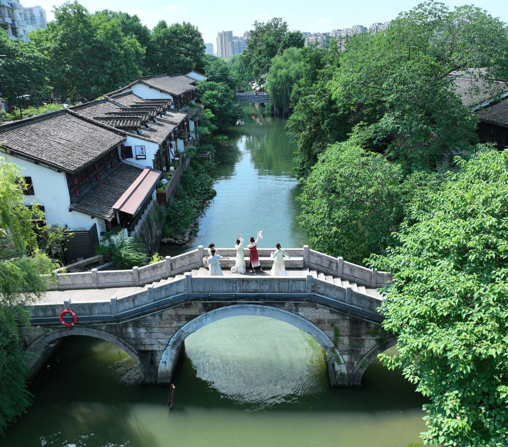 6月12日,在杭州小河直街历史文化街区,游客在一座石拱桥上游玩(无人机照片)。