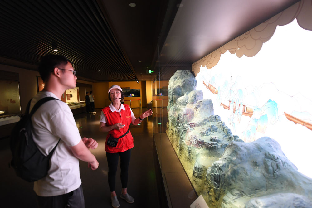 6月12日,讲解员在杭州京杭大运河博物馆给参观者介绍运河历史。