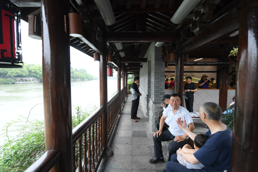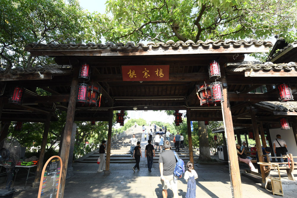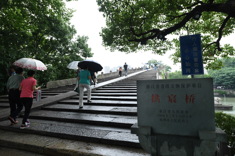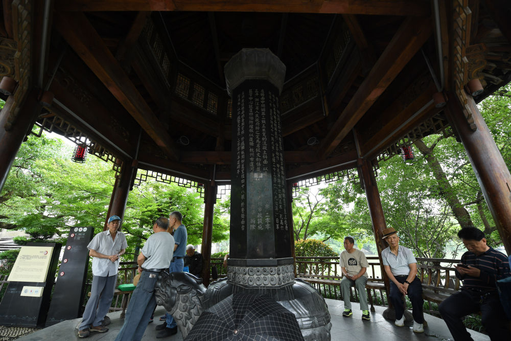 6月12日,人们在拱宸桥畔的碑亭休憩。