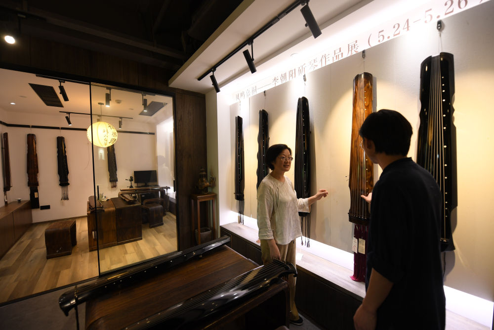 6月12日,在杭州大兜路历史文化街区一家古琴馆,工作人员向客人介绍正在举办的古琴展。