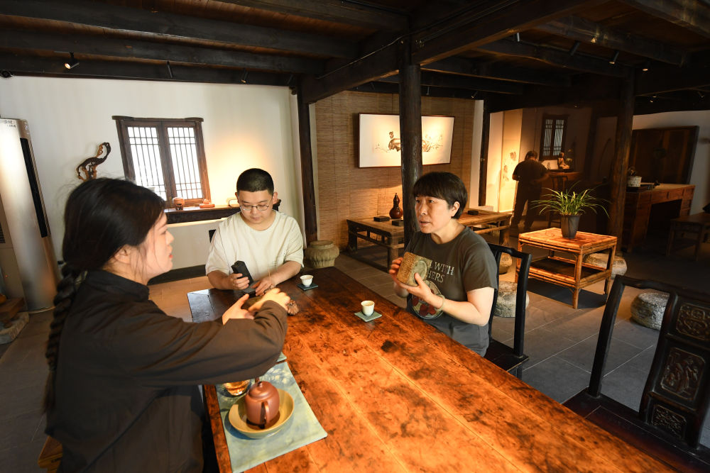 6月12日,在杭州小河直街历史文化街区,一个文化空间的主理人焦娇(左一)和朋友分享自己收藏的古砚。