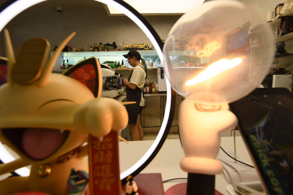 6月12日,人们走进杭州桥西历史文化街区一家潮玩主题的咖啡馆。