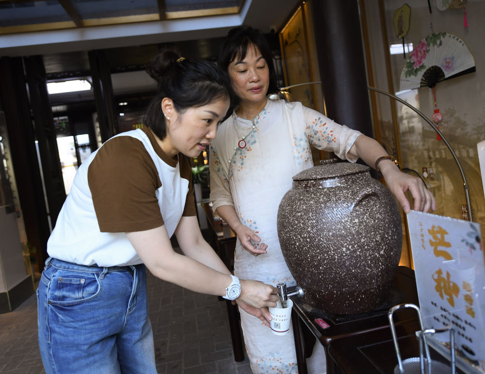 6月12日,在杭州桥西历史文化街区的大运河国医馆,游客在体验芒种节气茶。