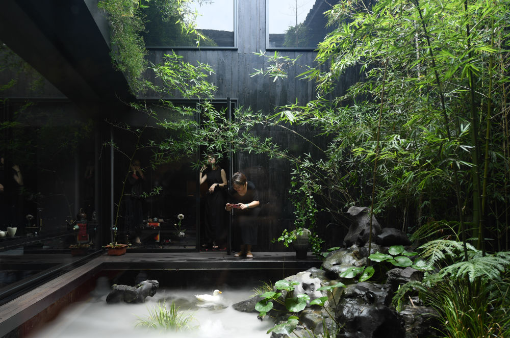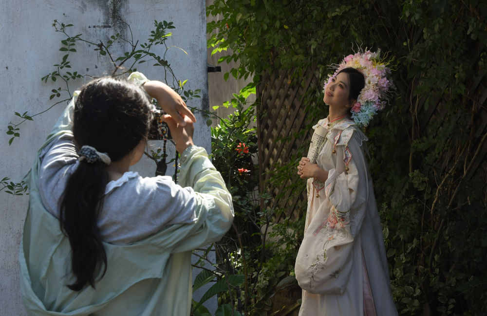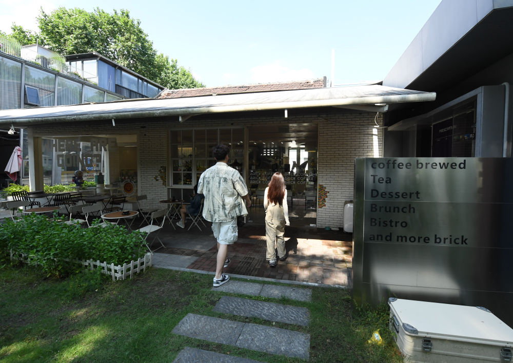 6月12日,在杭州大兜路历史文化街区的一家素食餐厅,客人在拍摄庭院的风景。