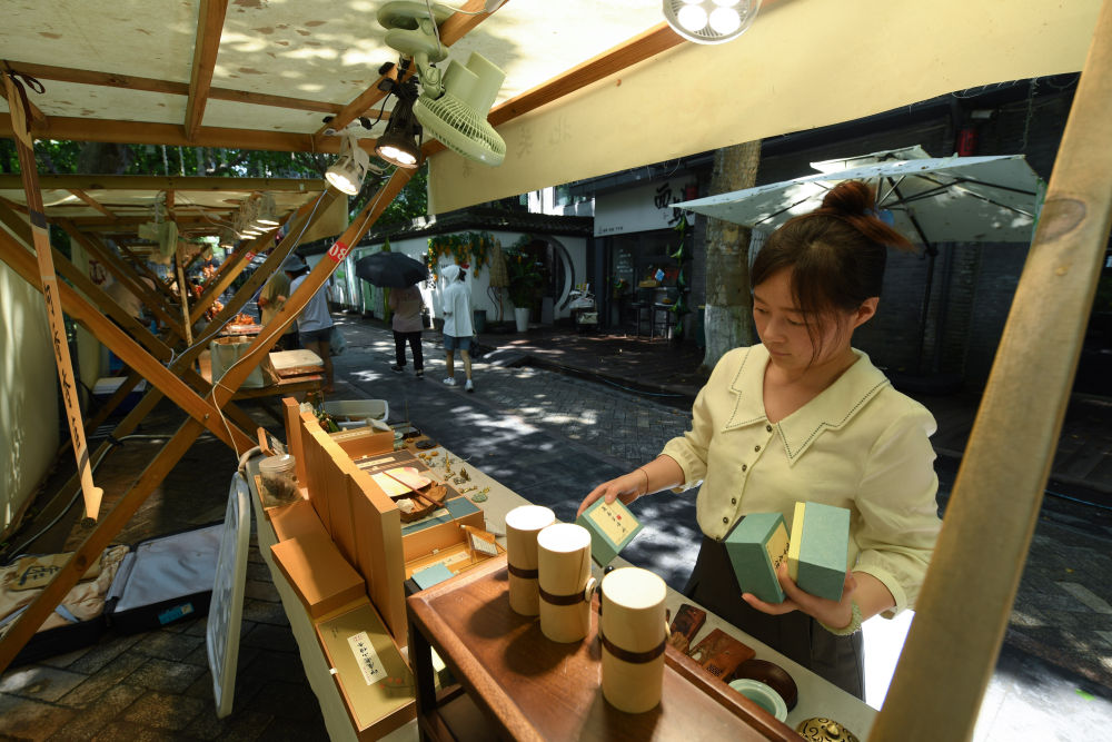 6月12日,在杭州大兜路历史文化街区,一名市集摊主在摆放创意香道用品。