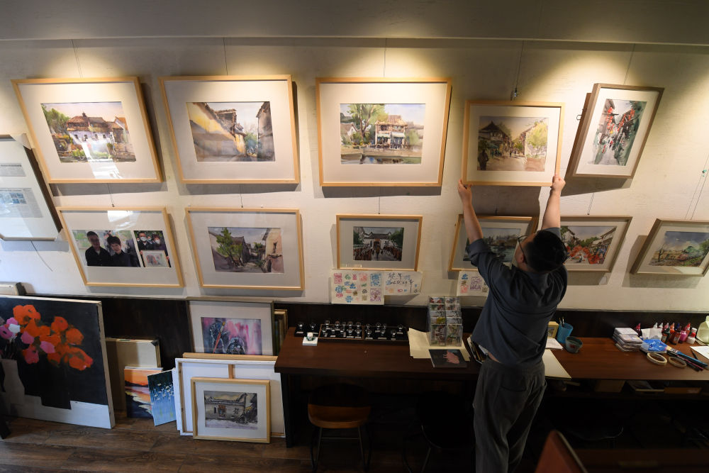 6月12日,在杭州小河直街历史文化街区,青年画家张甜甜在工作室悬挂自己创作的运河主题的水彩画。