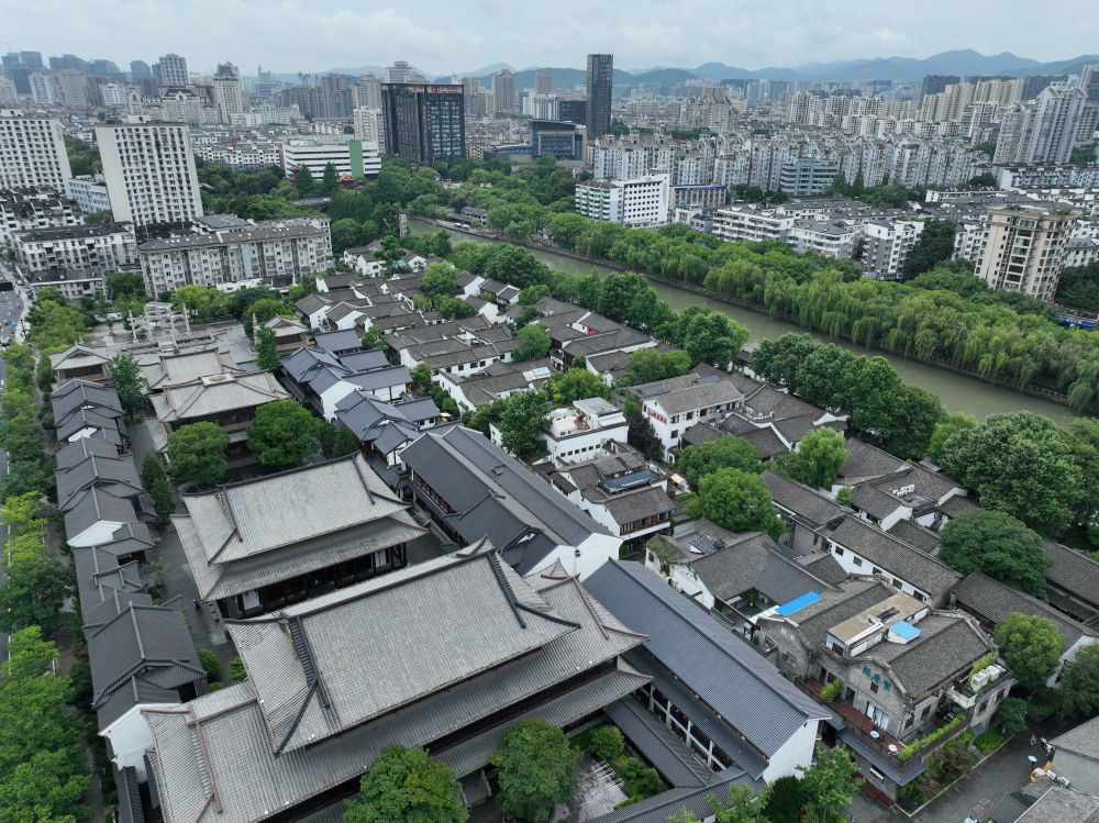 鸟瞰拱宸桥(左上)及附近街区(无人机照片,6月12日摄)。