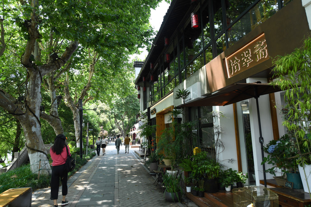 6月12日,人们在绿树成荫的杭州大兜路历史文化街区游览。