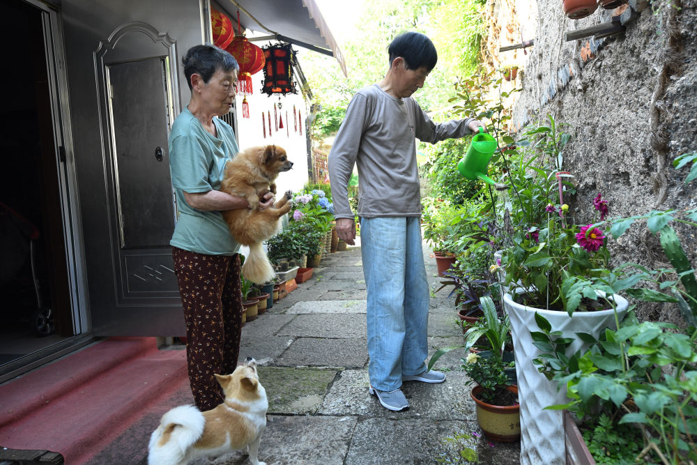 6月12日,在杭州桥西历史文化街区,市民程赞珍(右)、陈莉影夫妇在自家门口浇花。