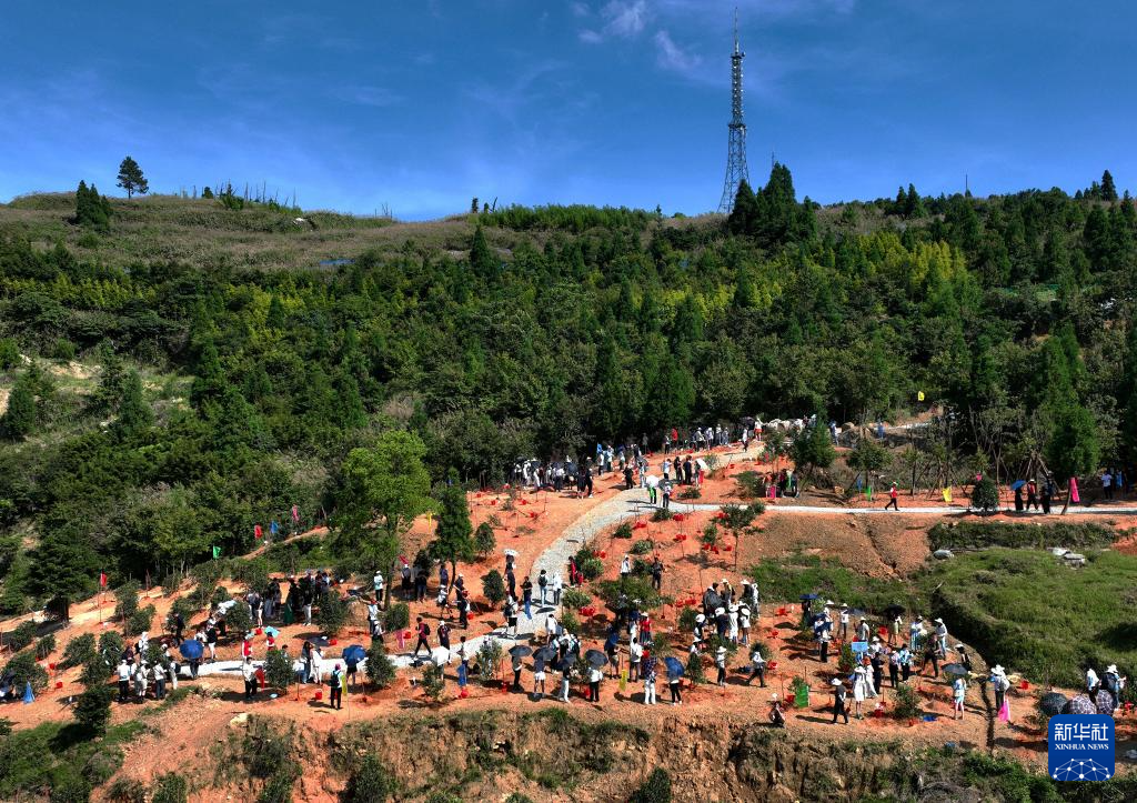 6月24日,参加2024“鼓岭缘”中美青年交流周的中外嘉宾们共植友谊树(无人机照片)。