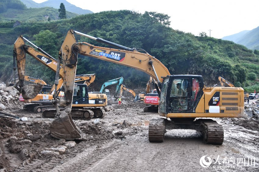 目前,挖掘机、装载机和运输车辆在新华村不停穿梭,数十台机械同时作业,各项抢险救援工作仍在继续进行。