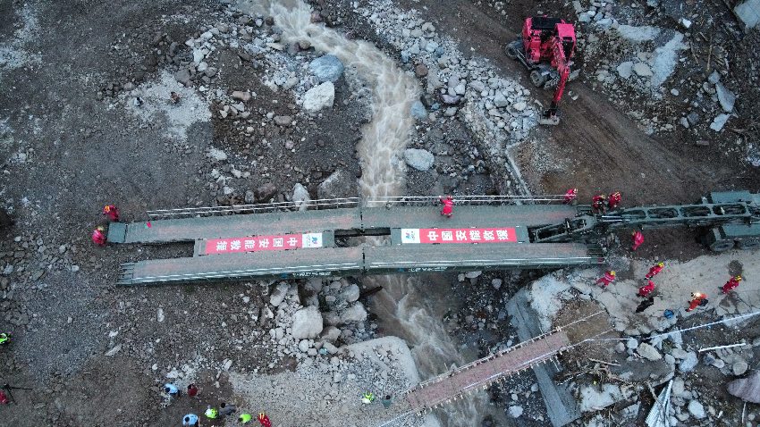 原本的石桥损坏后,救援队伍用木板搭了一座临时桥。7月21日晚上8点15分,就在受损的豆腐石桥位置,中国安能三局成功架设起一座应急机械化桥,解决了救援人员和重型机械通行问题,为后续人员搜救和应急保障提供了有力支撑。接下来,更多的大型机械将开进救援现场,搜救失联人员、排危除险、消杀等工作仍在继续。
