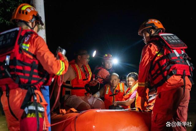 7月29日凌晨,在湖南省湘潭县易俗河镇四新堤附近,抢险人员在转移被困群众。新华社记者 陈思汗 摄