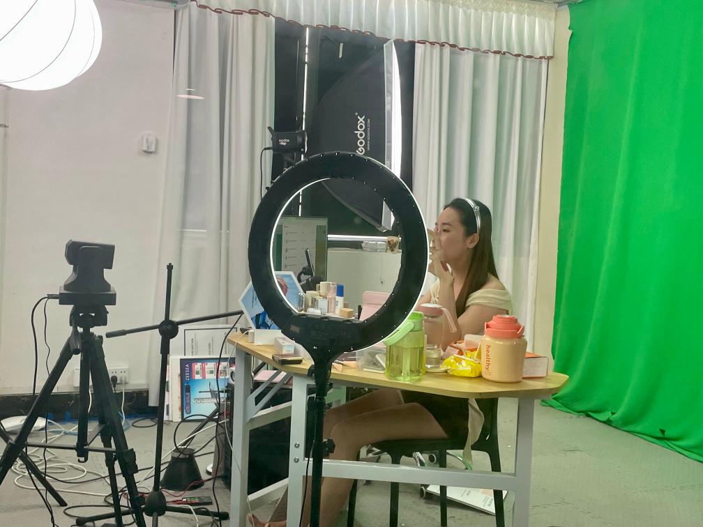 8月26日,在广西崇左凭祥市的凭祥跨境电商直播基地内,一名越南语主播正在向越南观众售卖来自中国的美妆产品。新华社记者李欢 摄