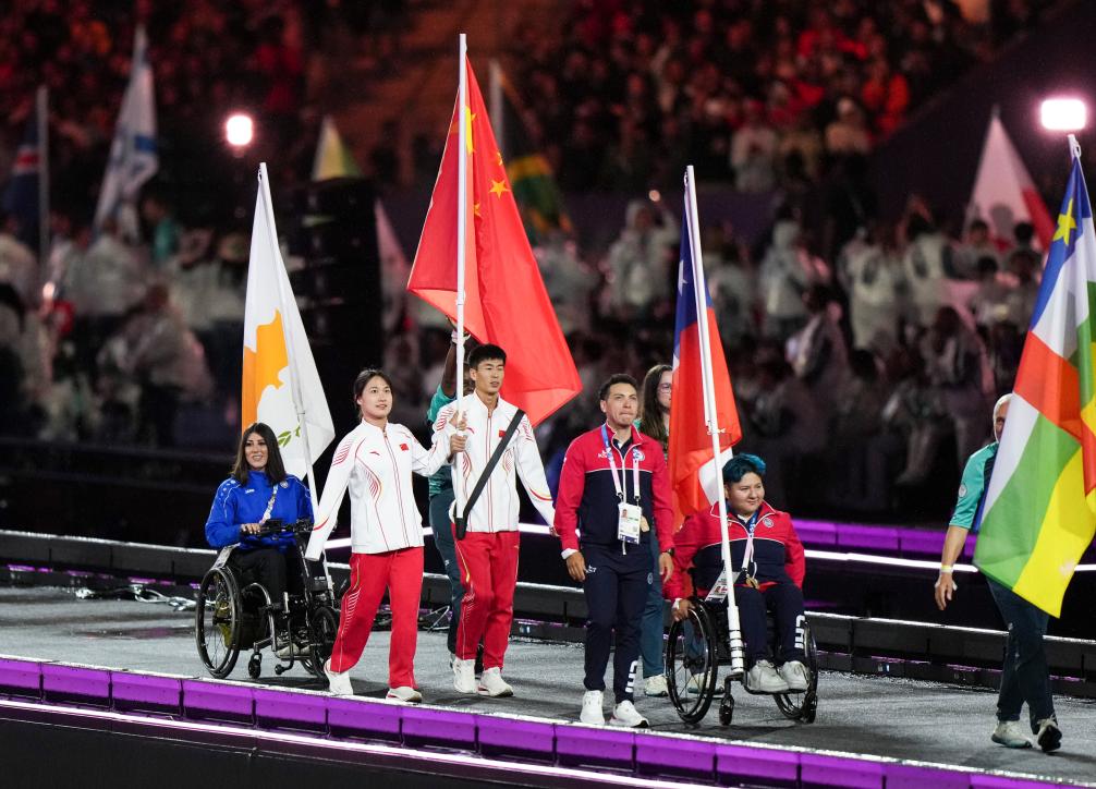 9月8日,巴黎残奥会中国体育代表团旗手女子游泳运动员蒋裕燕(左二)和男子田径运动员邸东东(左三)在闭幕式上入场。新华社记者 张铖 摄