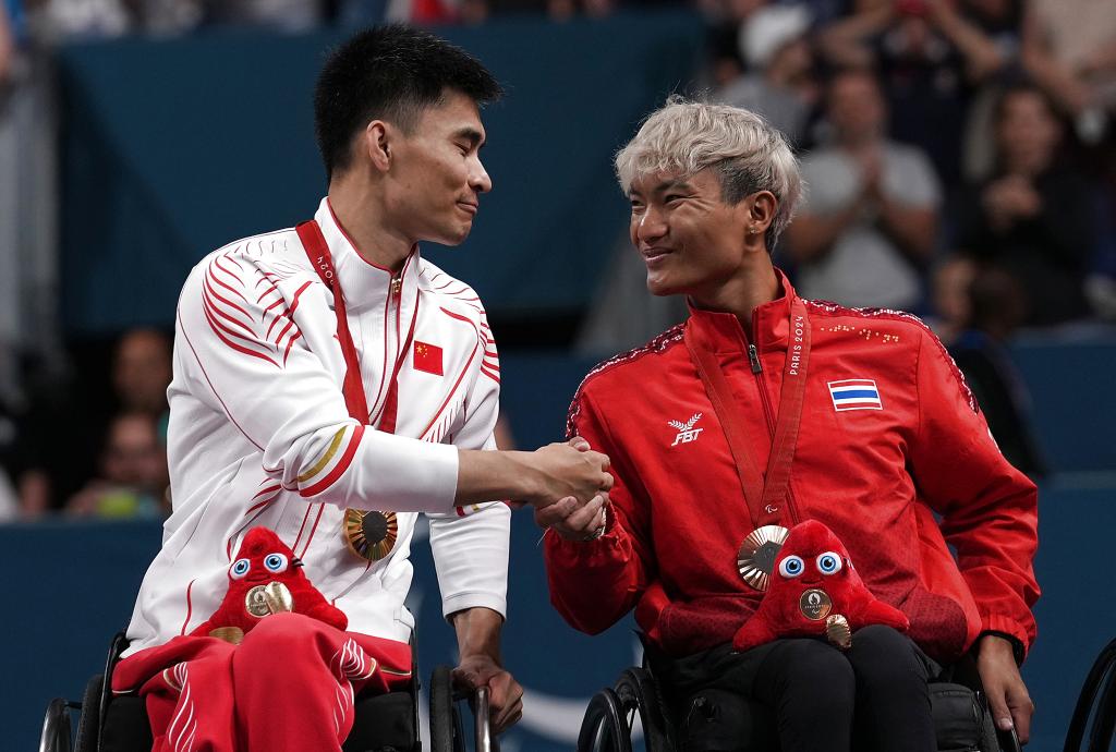 8月31日,中国运动员曹宁宁(左)在巴黎残奥会乒乓球男双8级颁奖仪式上与季军泰国选手格林班春(右,音译)握手。新华社记者 侯昭康 摄
