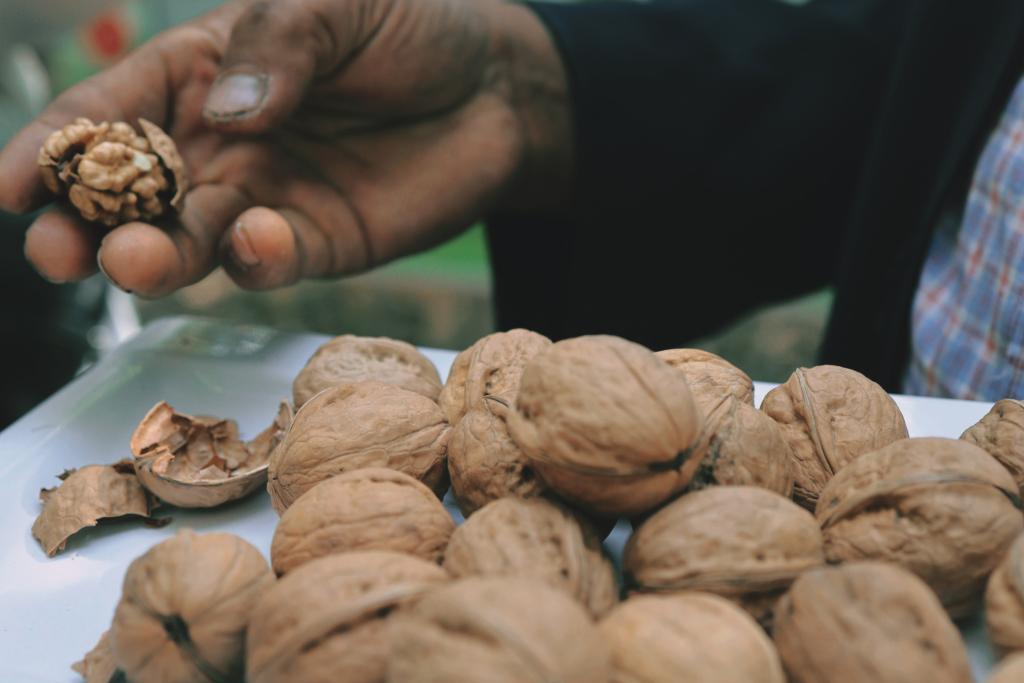 9月24日,温宿县核桃林里,果农掰开核桃。新华社记者 任沁沁 摄