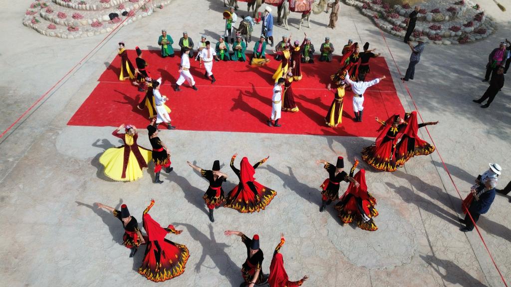 9月25日,演员在位于阿瓦提县的刀郎部落景区表演歌舞(无人机照片)。新华社记者 阮帅 摄