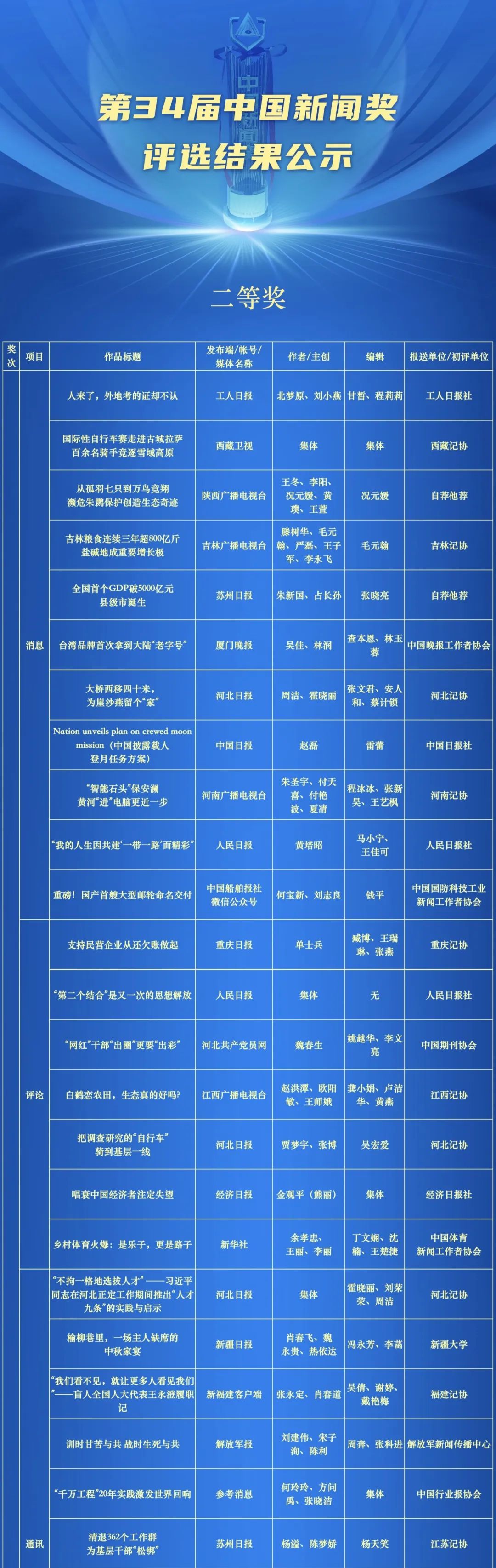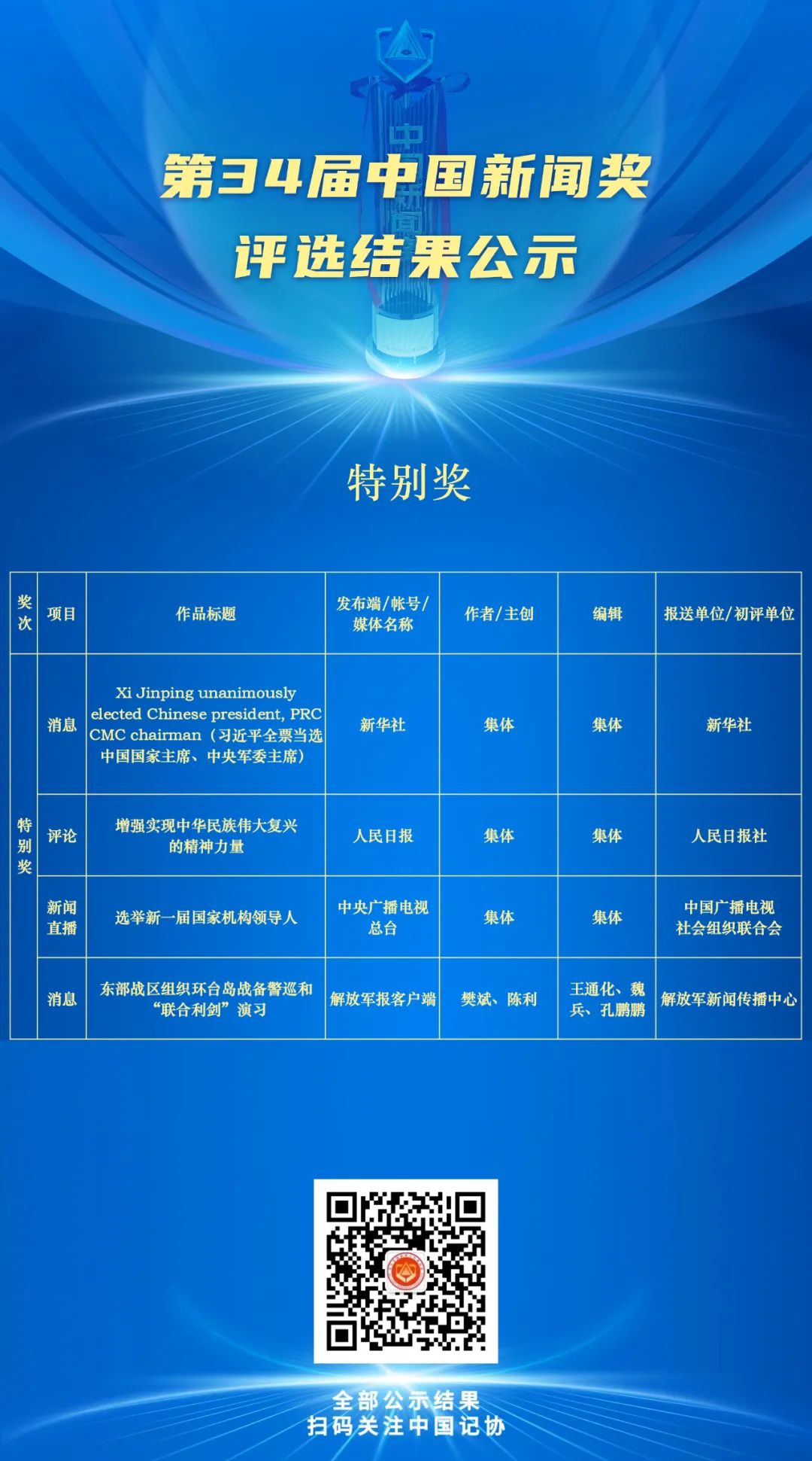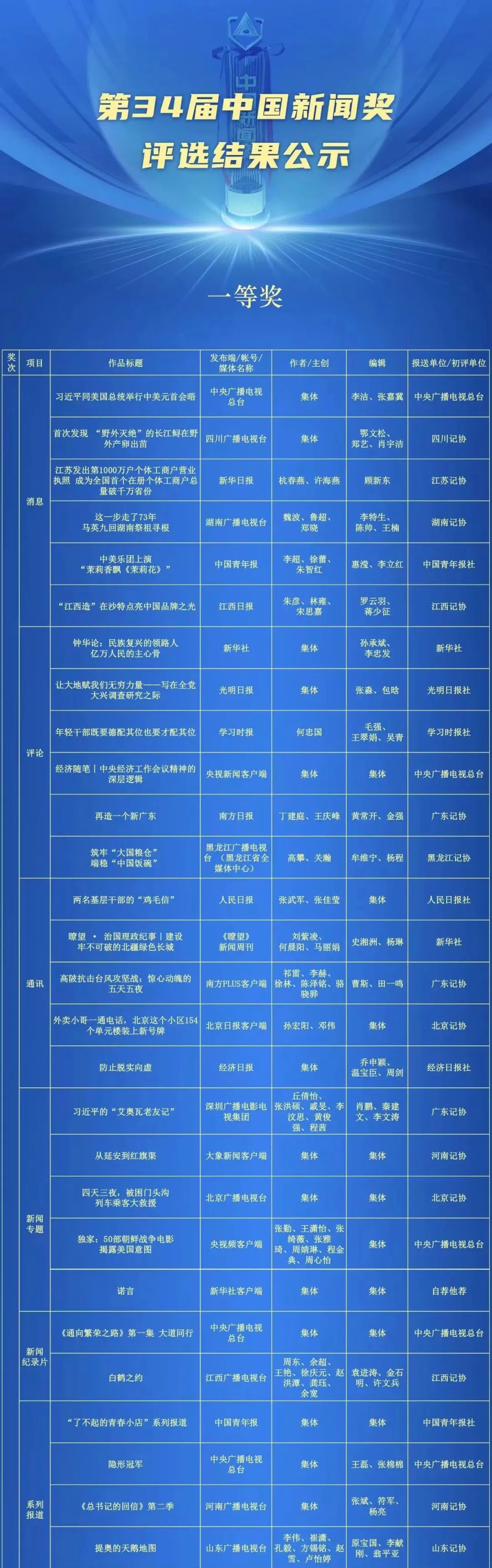 由中华全国新闻工作者协会(简称“中国记协”)主办的第34届中国新闻奖评选结果自今日起在中国记协微信公众号、中国记协网公示。本届拟获奖作品378件,其中特别奖4件、一等奖75件、二等奖111件、三等奖188件。