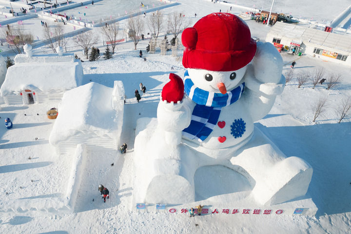 2024年1月9日,游客在哈尔滨外滩雪人码头游玩(无人机照片)。新华社记者 张涛 摄