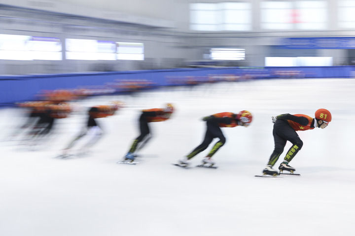 2022年1月10日,在七台河体育中心,七台河职业学院短道速滑训练中心的孩子们在进行训练。新华社记者 张涛 摄