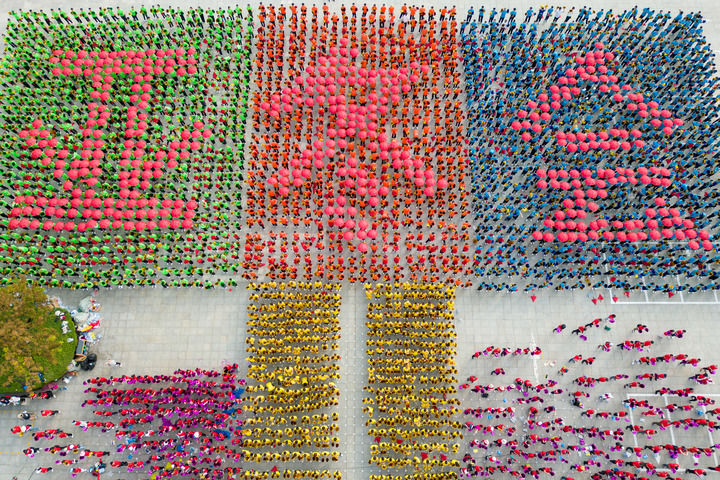 这是2023年7月8日拍摄的在哈尔滨市太阳岛景区太阳石广场举行的庆祝仪式现场(无人机照片)。当日,中国哈尔滨市获得2025年第九届亚洲冬季运动会举办权。新华社记者 张涛 摄