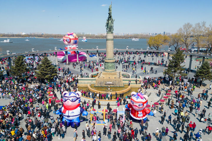 2024年4月19日,亚冬会吉祥物现身哈尔滨市开江民俗文化周开幕式现场(无人机照片)。新华社记者 张涛 摄
