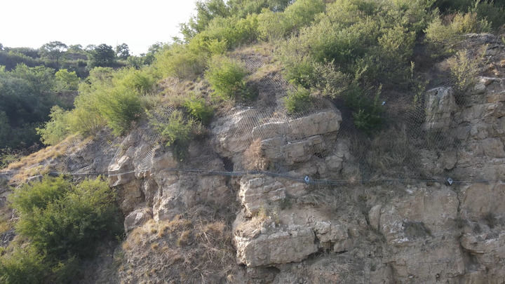 这是在山西省平陆县杜家庄段黄河岸边的古栈道上方布设的专业防护网(无人机照片,2024年6月17日摄)。新华社发(权永军)摄