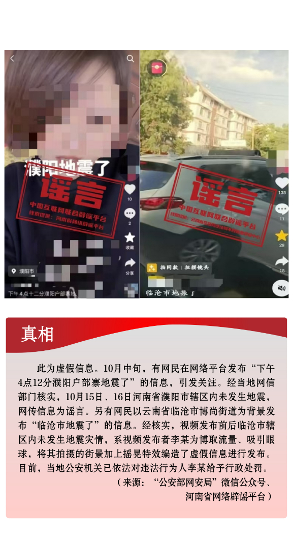 危言耸听炒作话题。个别网民和自媒体编造虚假信息,炒作社会热点话题,并配以具有煽动性、误导性的标题,扩散传播,扰乱社会秩序。10月中旬,新疆喀什、阿克苏地区相继发生地震,部分自媒体罔顾事实,利用AI技术拼凑网络旧图,编造完全与事实不符的地震废墟或灾后救援图片,混淆视听,严重误导网民。另有个别网民将拍摄的街景加上摇晃特效,恶意杜撰云南发生地震,引发公众恐慌,造成不良影响。还有网民为给网店营销引流,利用家长们高度关注儿童安全话题的心理,无中生有编造“四川巴中频繁有青少年失踪”谣言,引发公众焦虑恐慌。