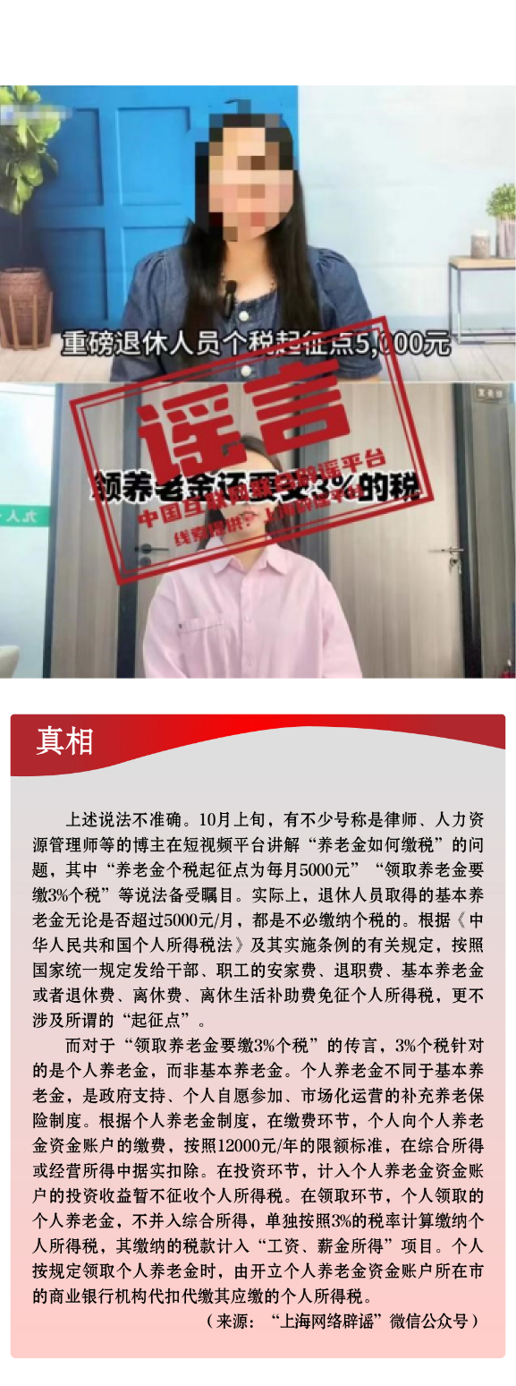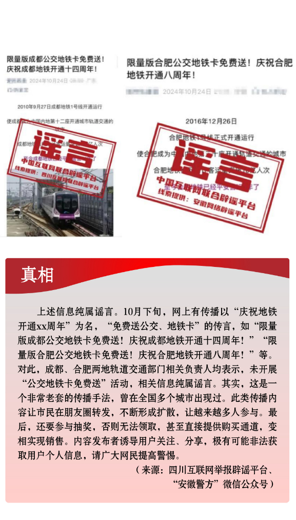 假冒官方虚构政策。一些不法分子冒充权威机构,散布涉公共政策类谣言,误导公众认知。有的假借官方名义,伪造政策文件,实则行骗牟利,侵犯群众利益。如有人利用公众对“大数据”“数字经济”等内容的认知盲区,假借“国家数据局”“中国人民银行数字货币研究所”等官方名义,伪造政策文件,谣称“国家数据局颁发‘个人数据资产拥有权确权凭证’”“数字人民币平台将发放‘数字资产红利’”,相关部门均已发布辟谣声明。有的从公开发布的政策信息中摘取碎片化信息,断章取义,对政策歪曲解读。如个别自媒体故意混淆“个人养老金”与“基本养老金”的概念,传播“领取养老金要缴3%个税”“养老金个税起征点为5000元”等不实信息,引发公众误解。另有“成都、合肥等地免费送公交地铁卡”谣言,以“免费”“赠送”为噱头,诱导用户关注、分享,最终可能导致用户遭受个人信息泄露或其他不法侵害。