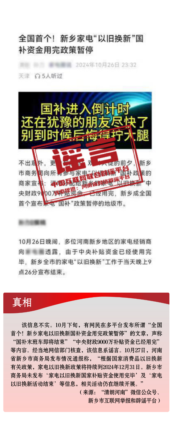 河南新乡家电“以旧换新”国家补贴资金用完、政策暂停?