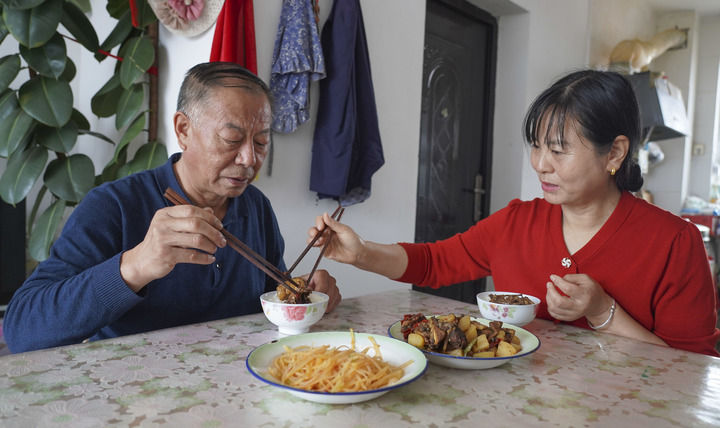 2024年10月17日,李琳和妻子李秀梅在家吃午饭。新华社发(官航 摄)