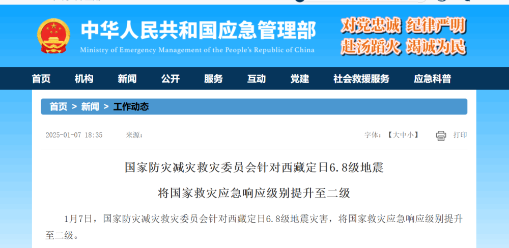 1月7日,国家防灾减灾救灾委员会针对西藏定日6.8级地震灾害,将国家救灾应急响应级别提升至二级。