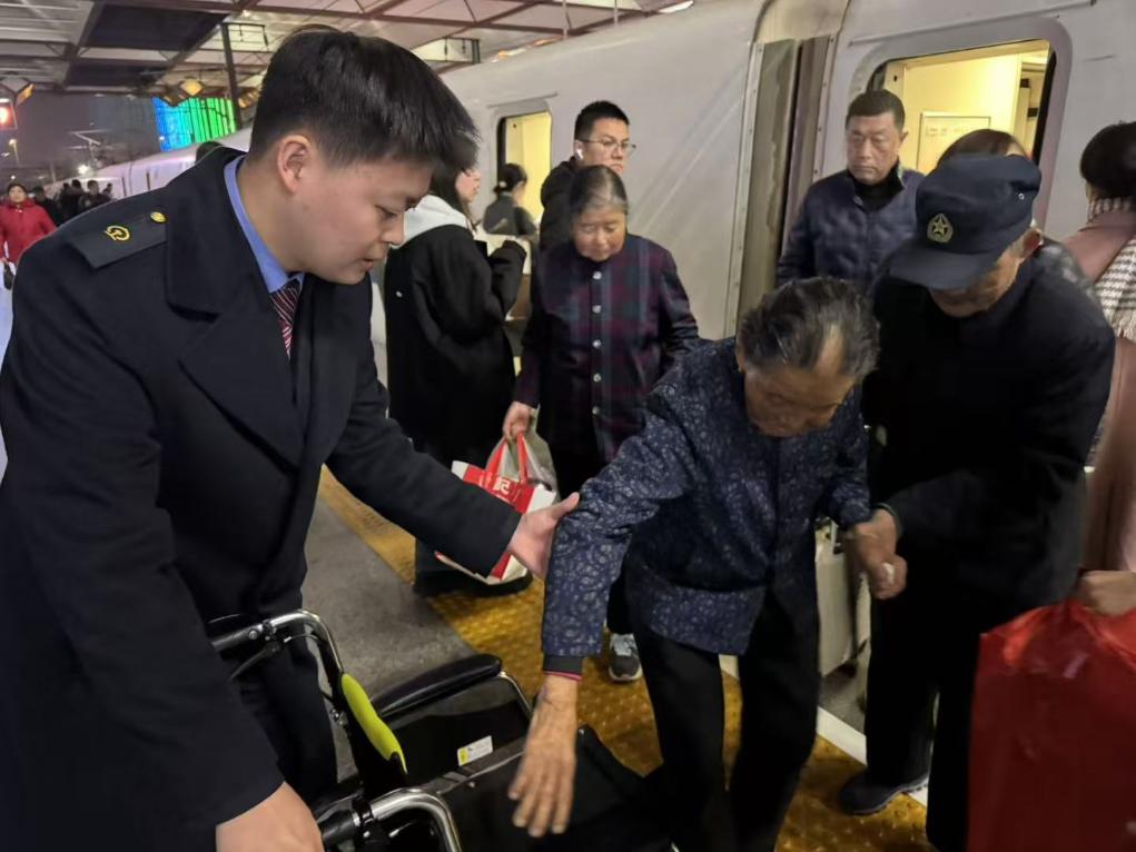 图为1月18日,苏州站铁路工作人员为进城高龄老人提供暖心到站接车服务。新华社发 马骁摄