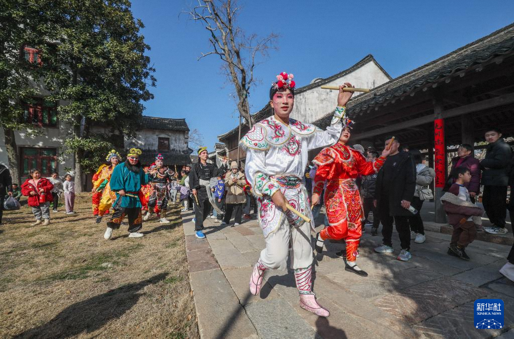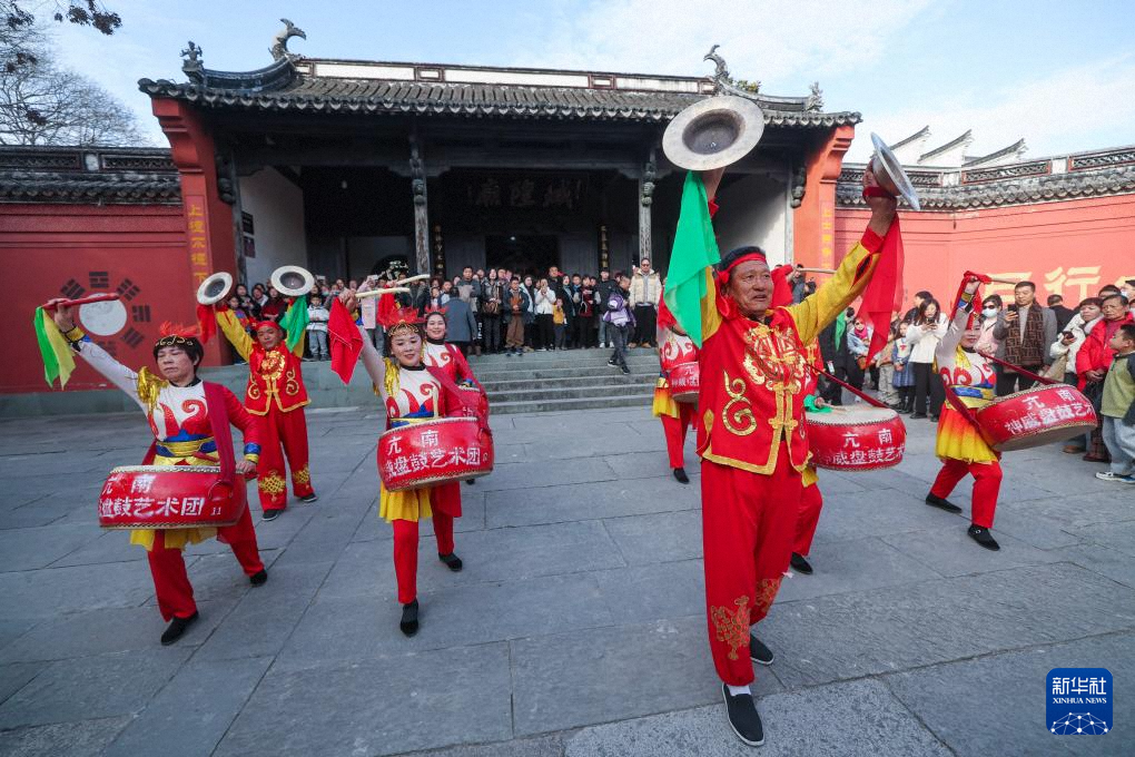 1月30日,演员在浙江嘉兴海宁市盐官镇的盐官潮乐之城为游客表演盐官盘鼓。新华社记者 徐昱 摄